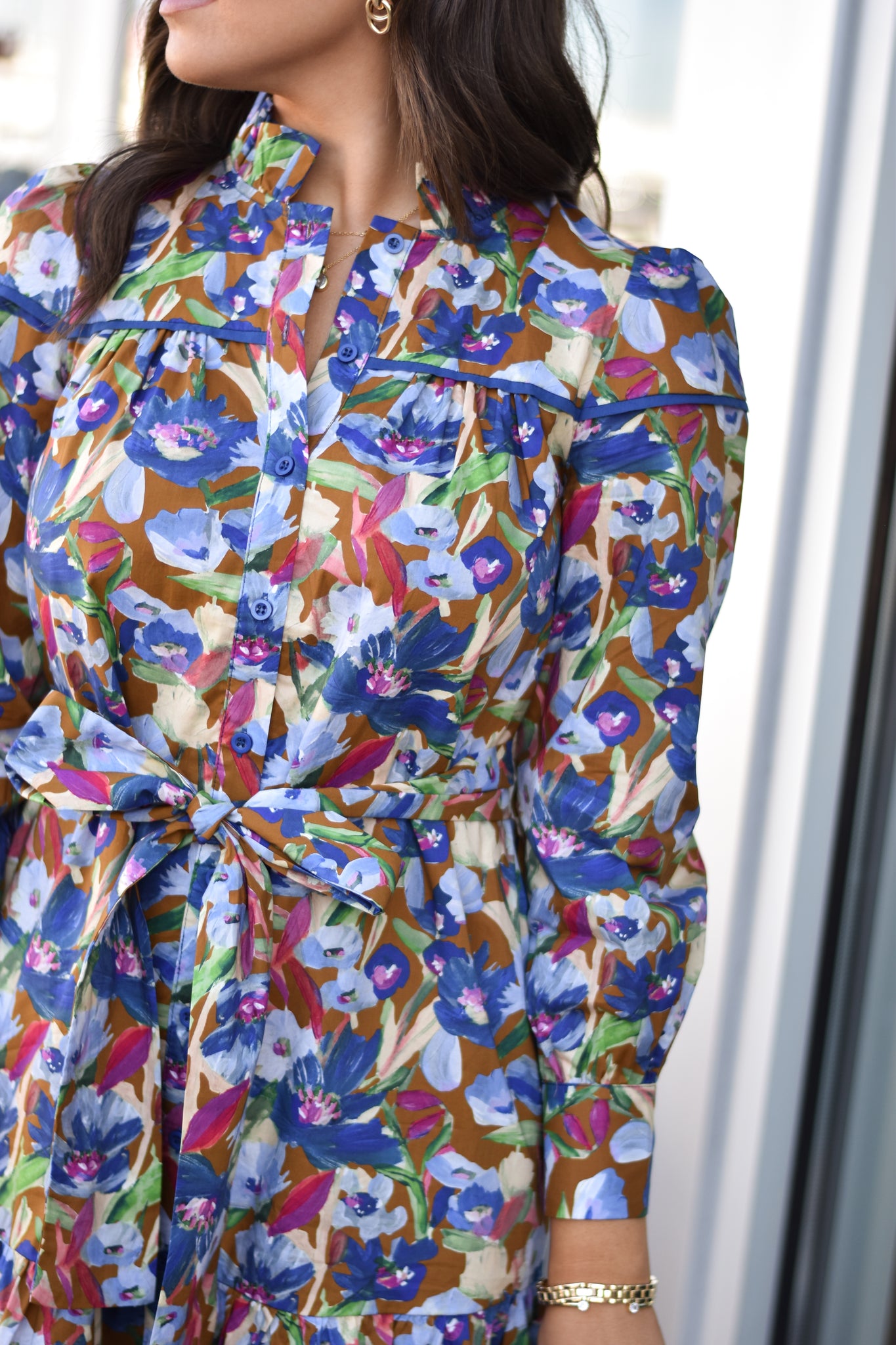 Long sleeve peplum bottom floral dress with blue piping detailing and optional belt