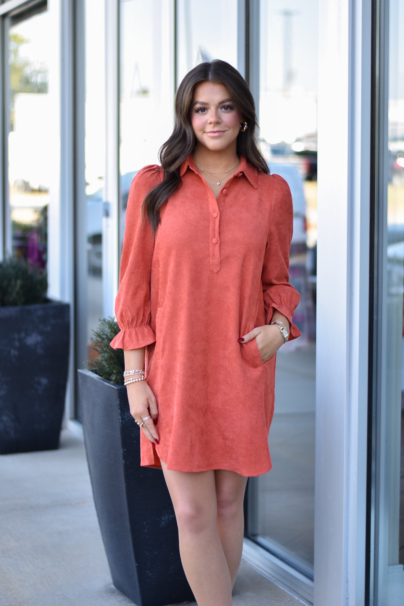 Collared corduroy dress with front pockets and gathering at the sleeves