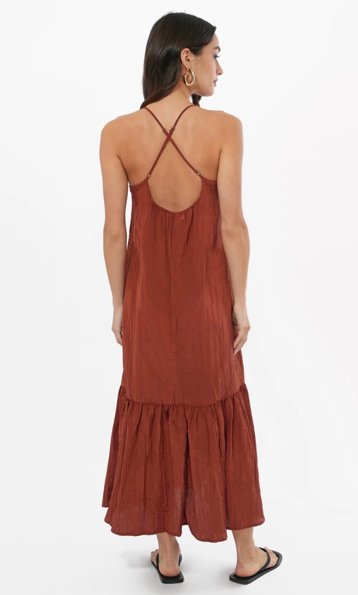 Cut from a soft and flowing crinkled fabric, it features a subtle texture that adds depth to its solid color. The dress boasts low, open back with delicate cross-back spaghetti straps.