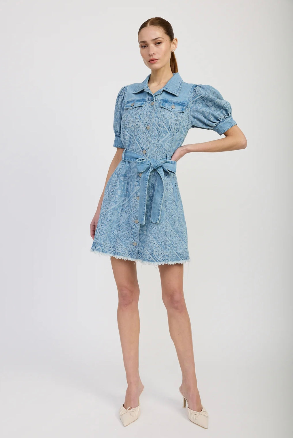 Jacquard Denim Puff Sleeve Tie Waist Mini Dress