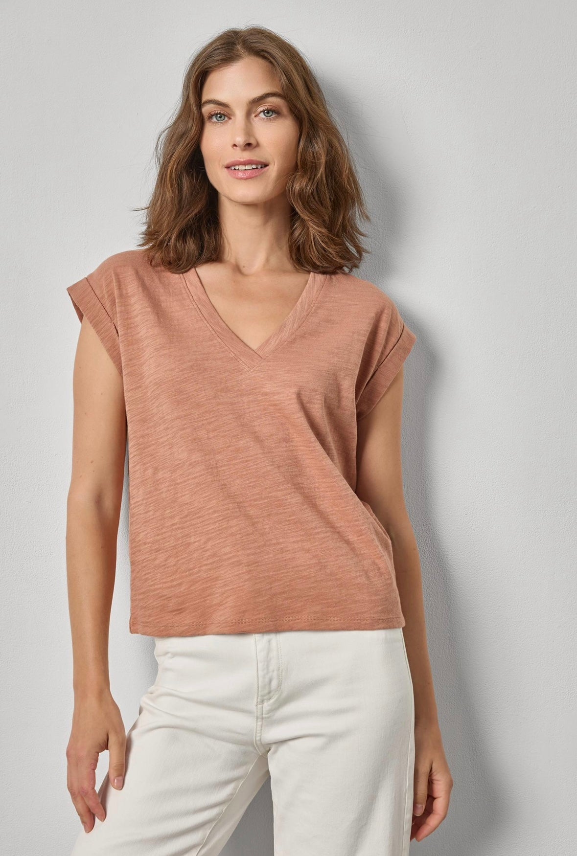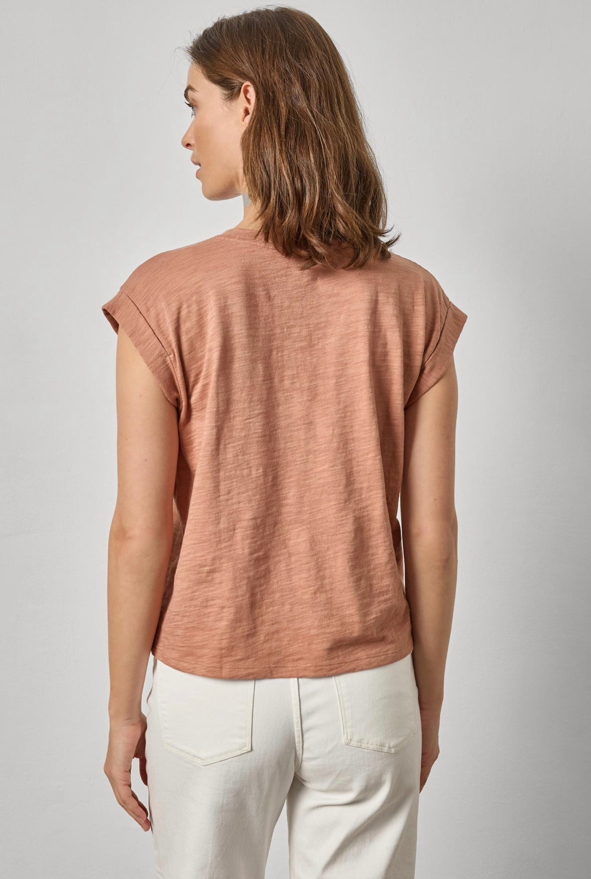 The Cuffed Sleeve V-Neck is a feminine yet modern staple in our Loose Knit Cotton Slub. Designed with a flattering V-neckline and boxy shape, it has a slightly shorter body length for an updated silhouette. The small cuffed sleeves add just a touch of coverage, making this style the perfect bridge between a tank and a short sleeve tee.