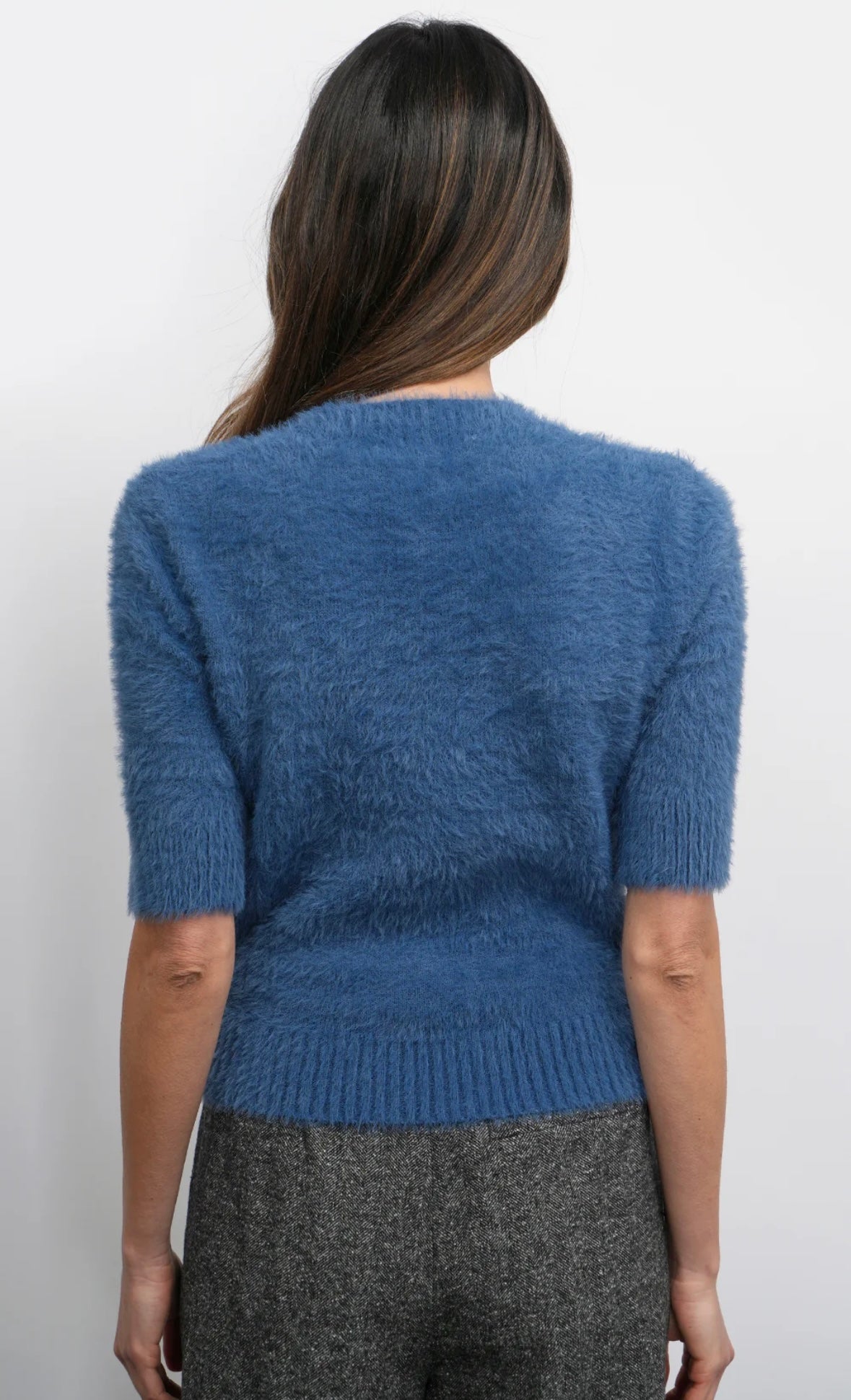 This top is crafted from a plush, fuzzy knit fabric in a rich indigo blue color. It features a fitted silhouette with elbow-length sleeves and a high, round neckline. The soft, textured material gives it a luxurious feel, while the simple yet elegant design makes it a versatile layering piece for any occasion.