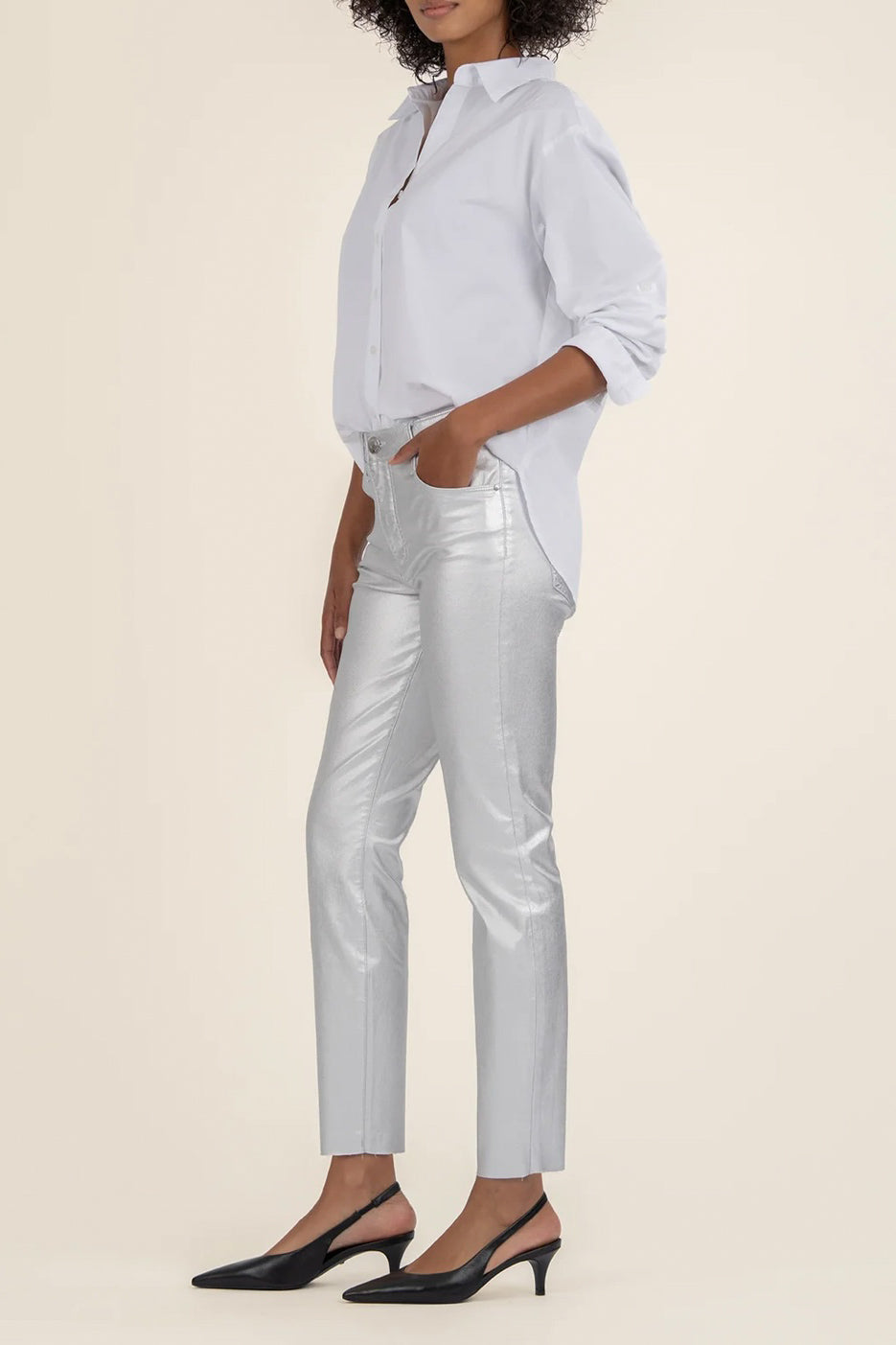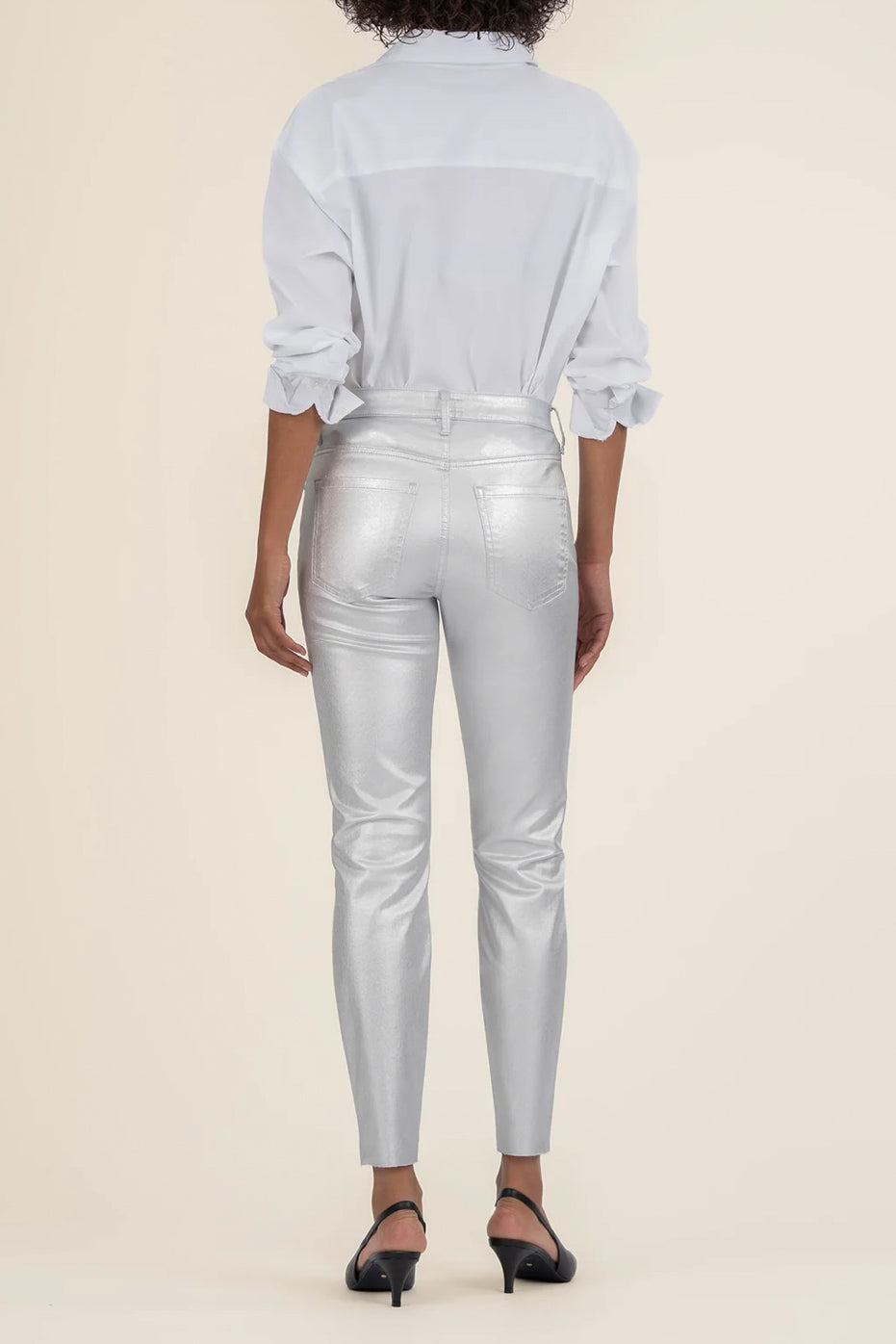 - The ultimate statement pant designed to elevate your holiday style. This high-rise silhouette features Fab Ab pockets for a smoothing fit, a sleek cigarette leg with a raw hem, and a metallic coated silver finish that brings an edgy, festive vibe. Finished with a touch of stretch, it’s made to move with you from holiday parties to standout nights out.