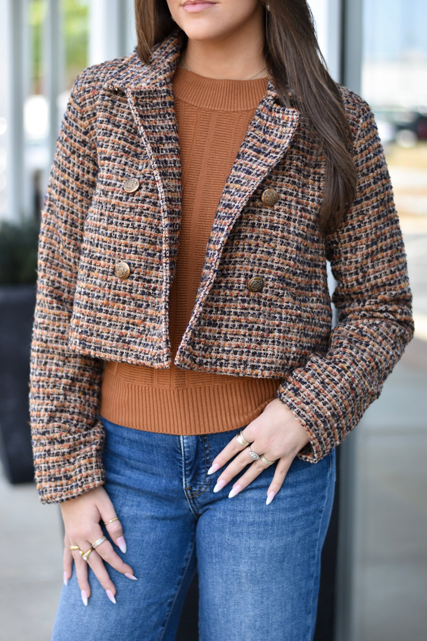 A cropped silhouette enhances the smart style of this structured cropped jacket cut from textured tweed and fashioned with functional front buttons.