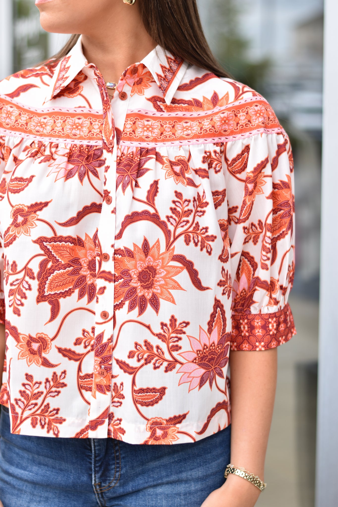 Round yoke floral button down with gathering at the sleeves