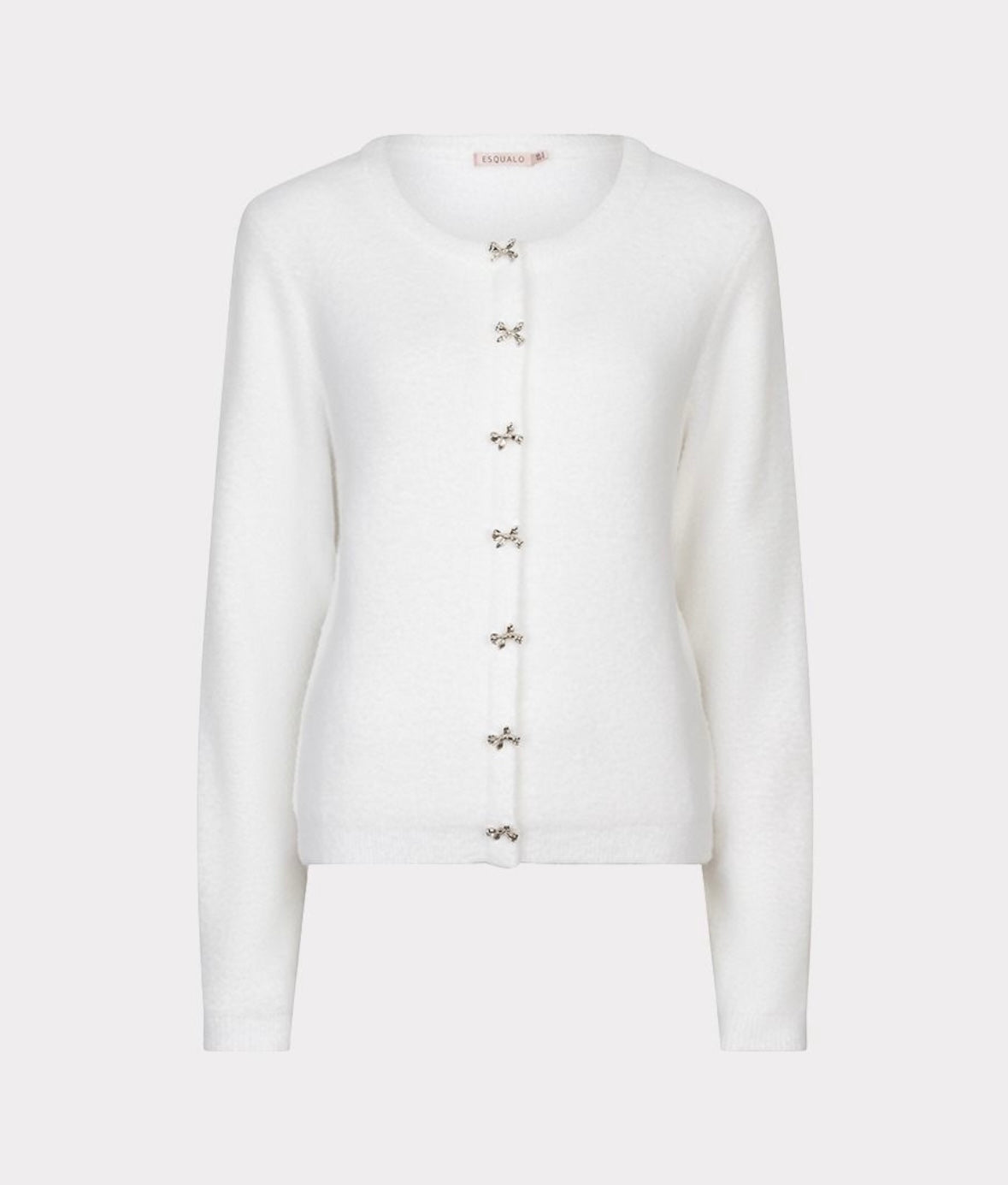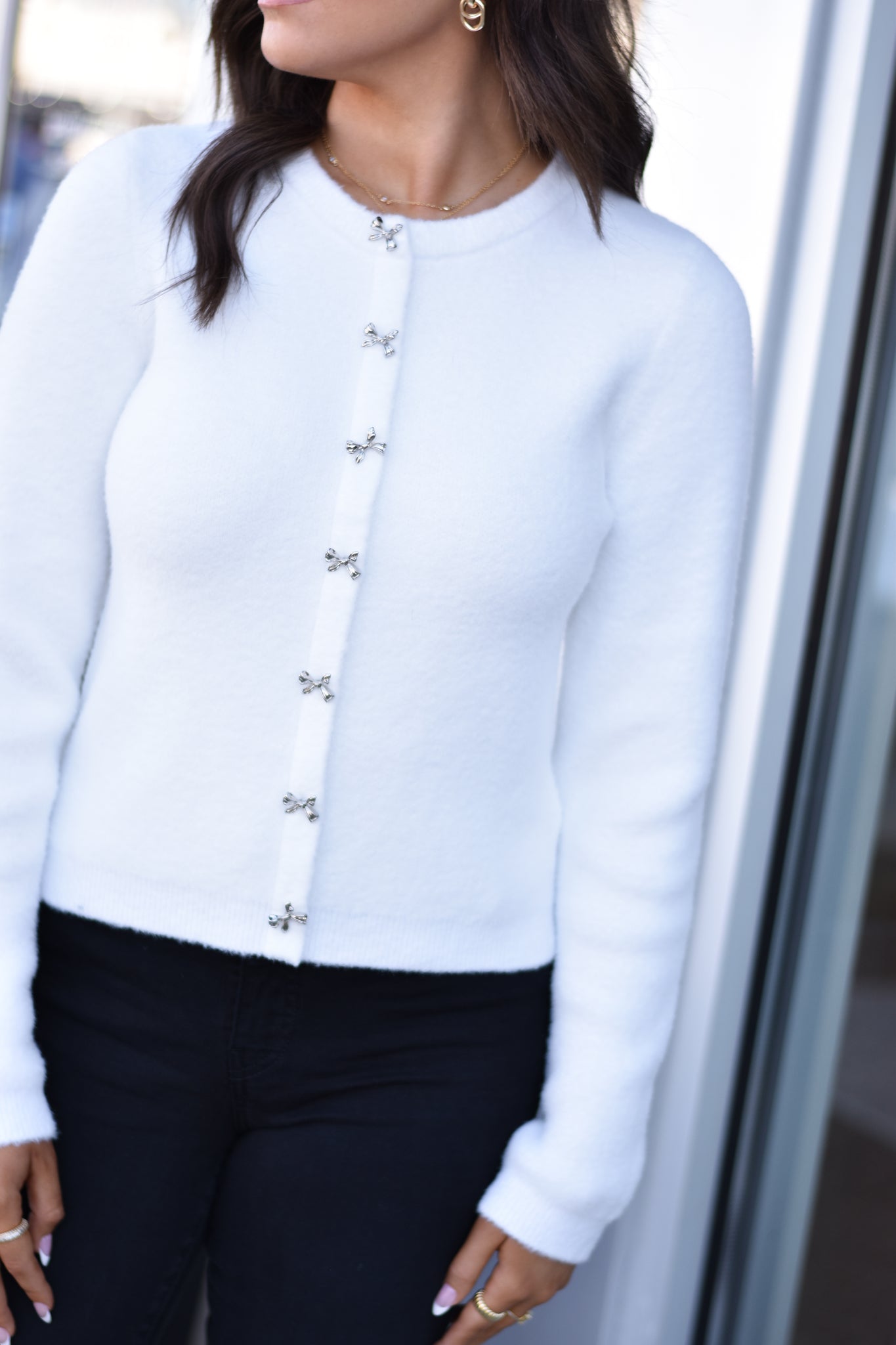 Crew neck cardigan sweater with functional front bow buttons