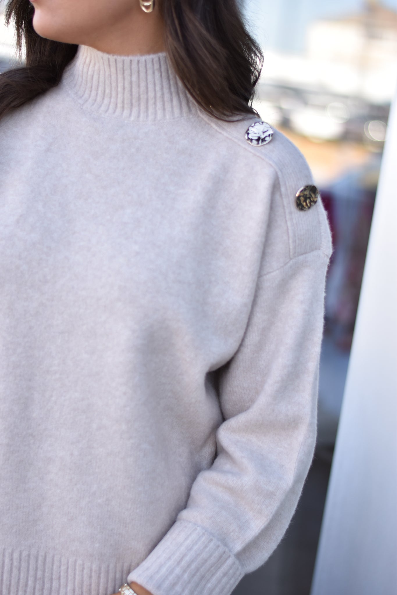 Long sleeve turtleneck sweater with bold buttons along one shoulder