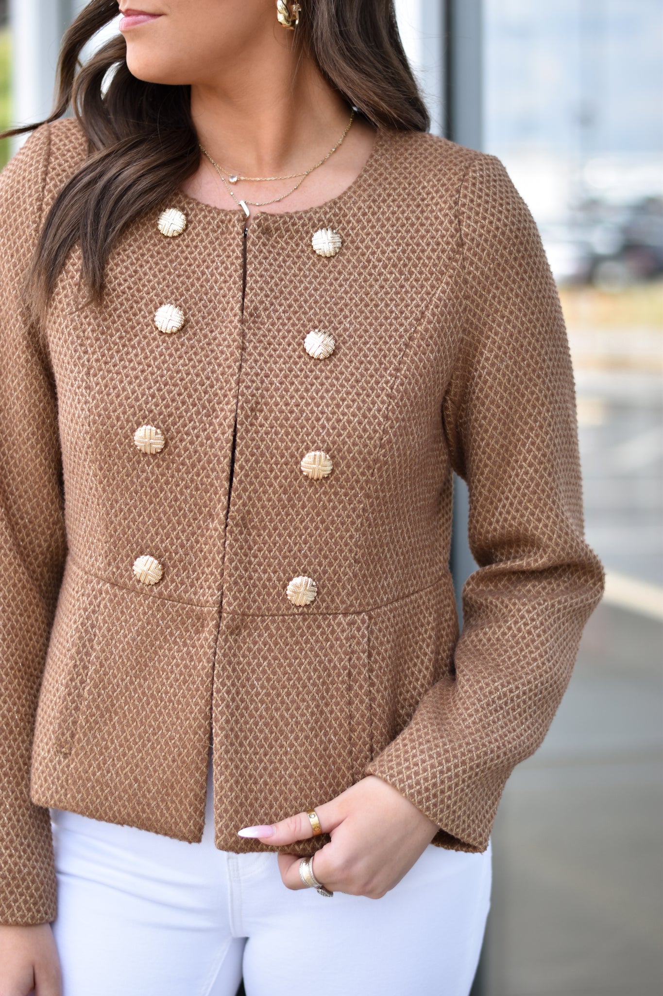 Woven fit and flare jacket with gold button detailing