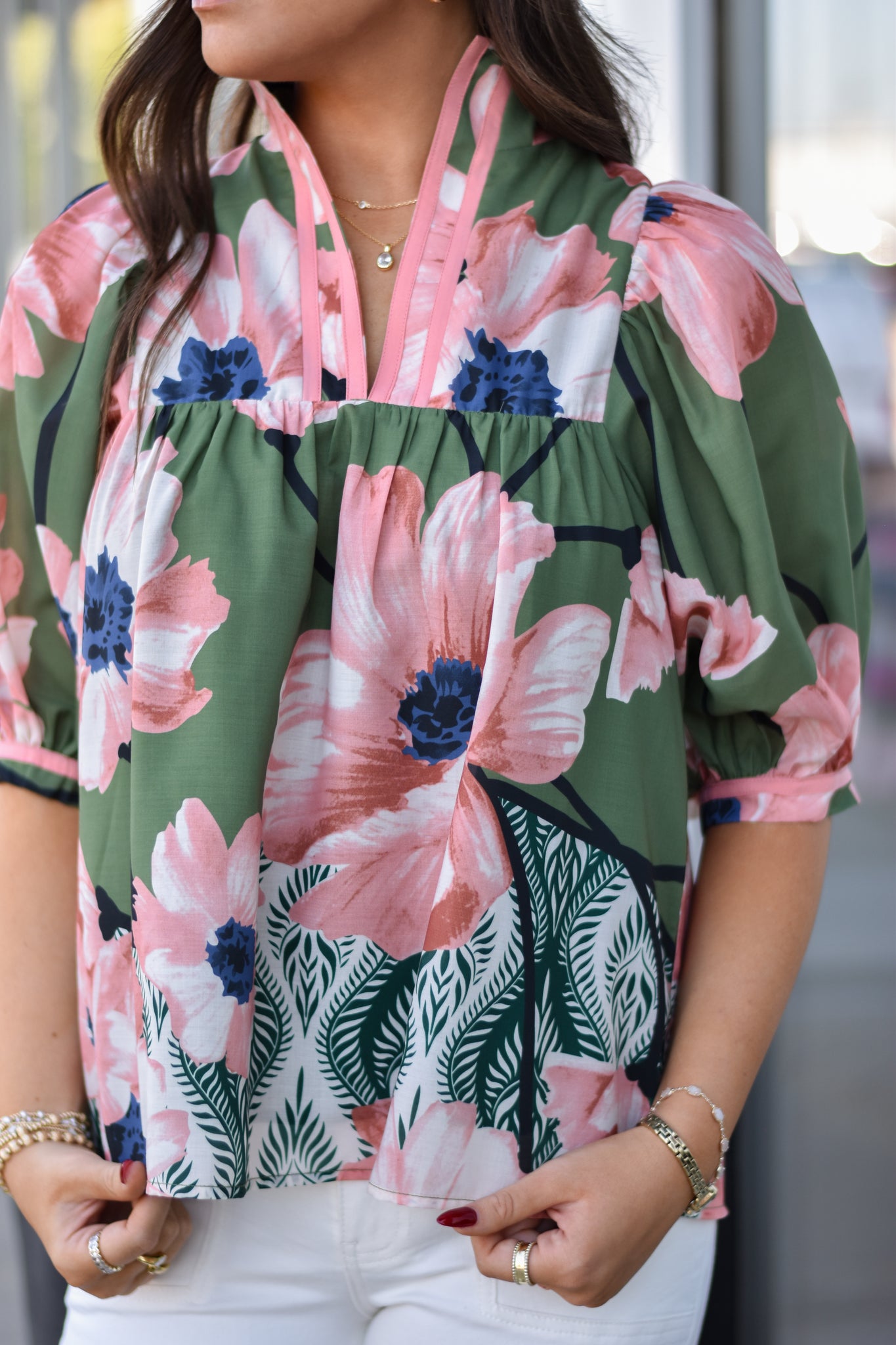 Floral 3/4 sleeve blouse with trimmed standing collar