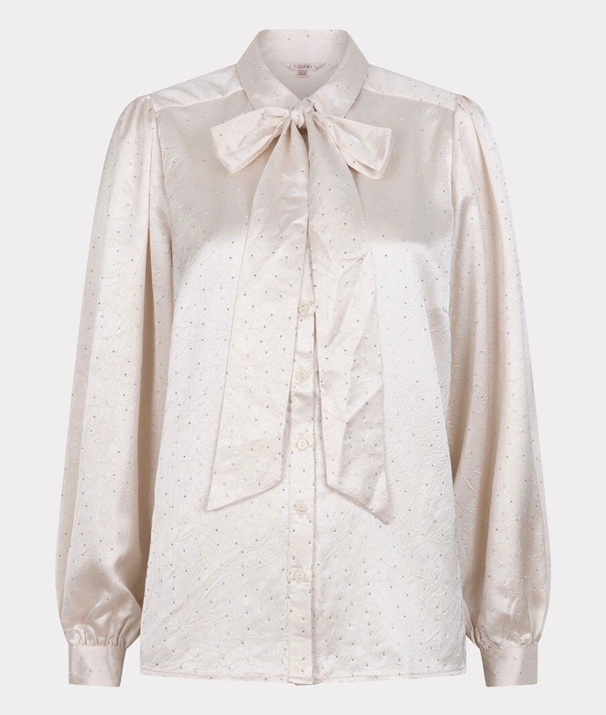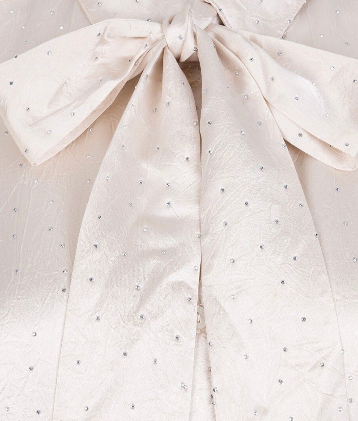 Collared button up with silver rhinestones, pleated shoulder detailing, and optional/removable neck tie